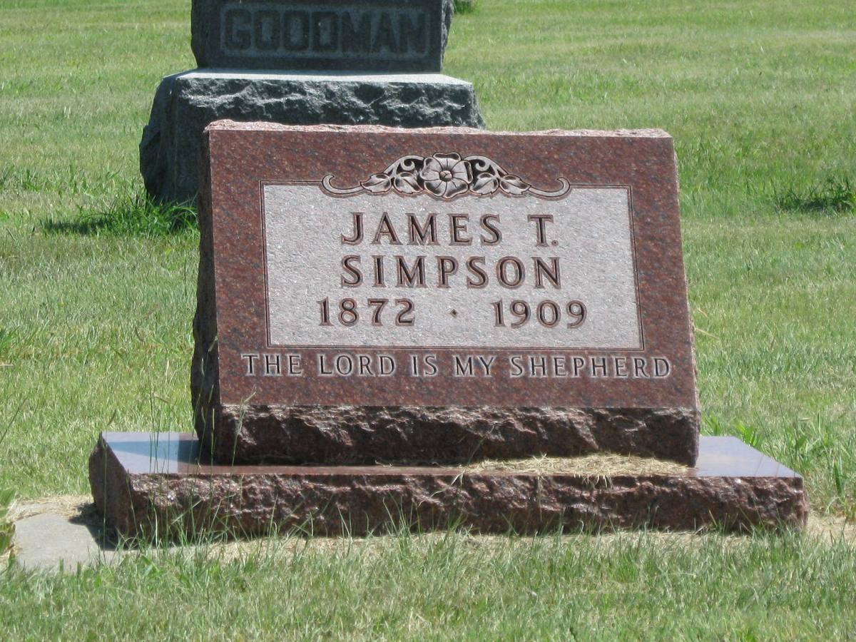| Simpson | James T. | 8/19/1872 | 11/25/1909 | The Lord Is My Shepherd | Married Ivah McCullun Dec 24, 1908. Obit | |