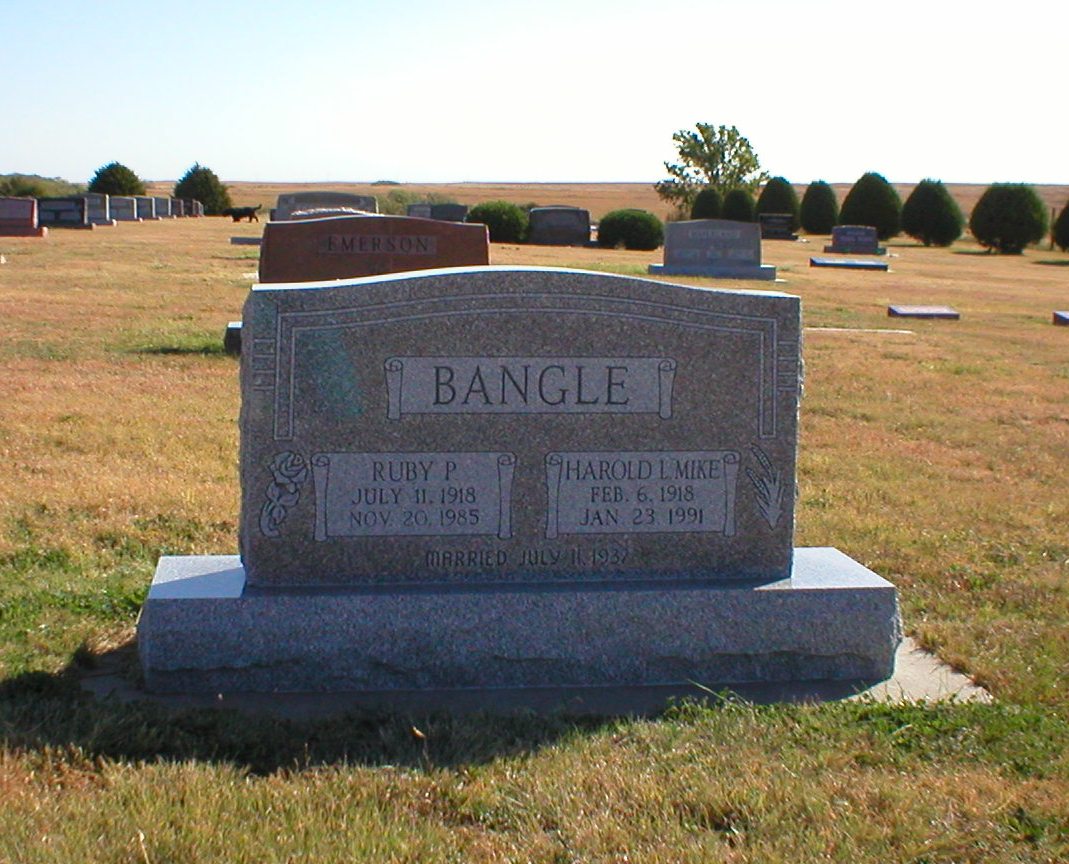 | Bangle | Ruby P. | 7/11/1918 | 11/20/1985 | Married 7/11/1937 | Same stone as Harold L. "Mike" Bangle. Maiden name was Montgomery. Obit | |