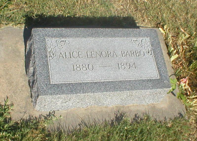 | Barbo | Alice Lenora | 1880 | 1894 | All a part of the BARBO plot next east that has several relatives buried in it. Daughter of Joseph and Marie Octavia (Girard) Barbo. | | |