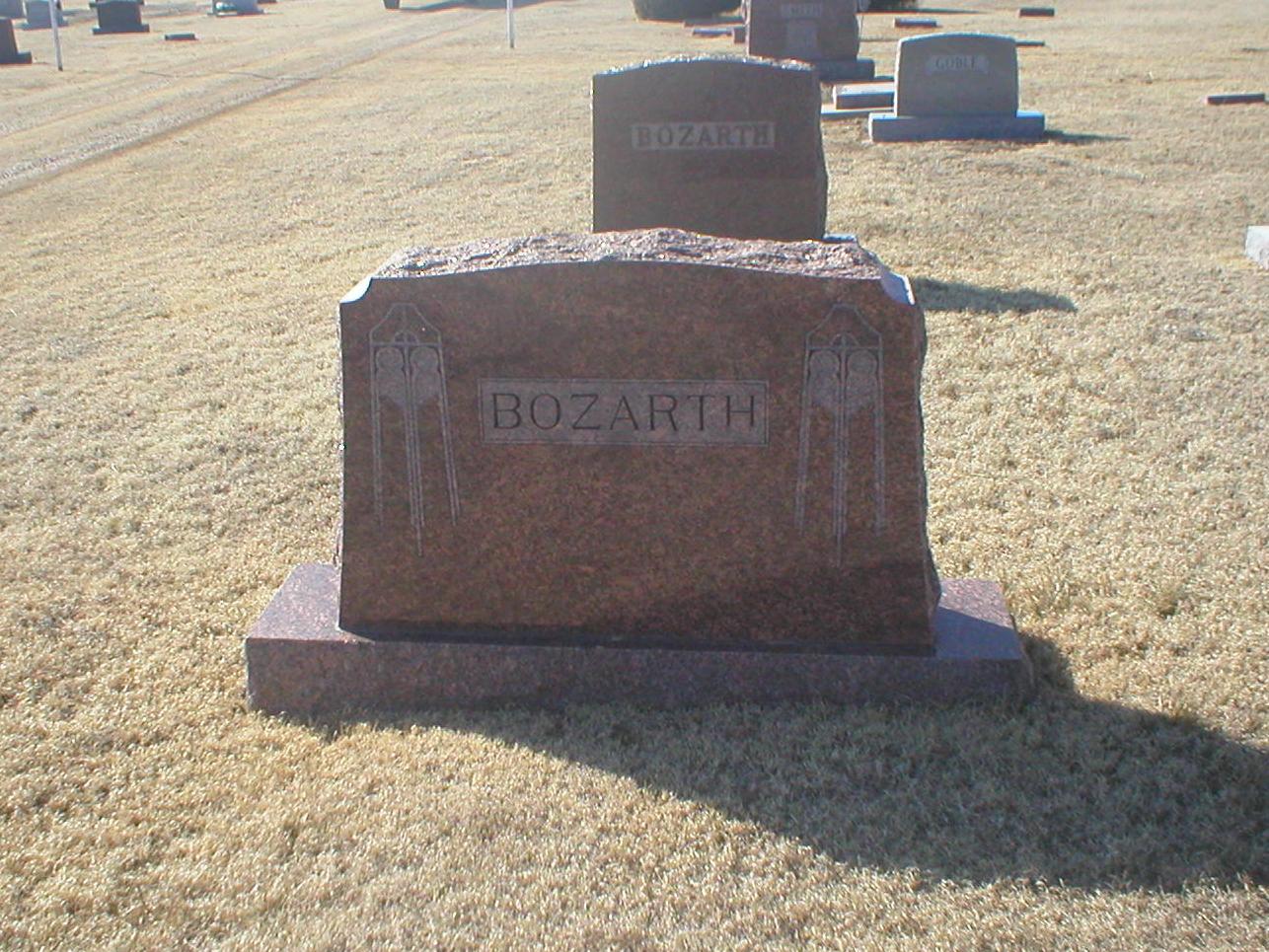 | Bozarth | Roy B. | 3/17/1876 | 12/29/1937 | Large center BOZARTH stone; individual information on footstones. Royal Benjamin Bozarth, son of John Perry and Eliza Jane (Miller) Bozarth. | | |