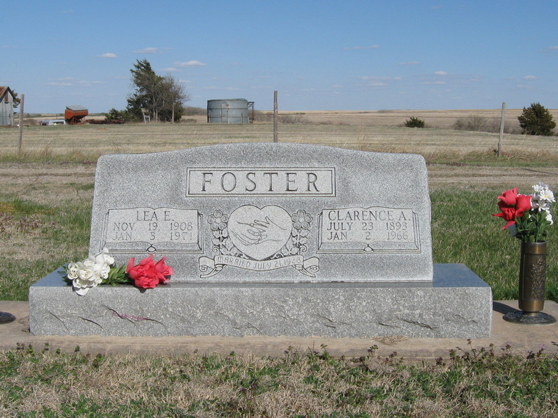 | Foster | Clarence A. | 7/23/1893 | 1/2/1966 | Married July 21, 1928 | Same stone as Lea E. Foster. Military marker Clarence A Foster Kansas Pvt. 142 Spruce Sq. World War I July 23,1893 - Jan 2,1966 Obit | |