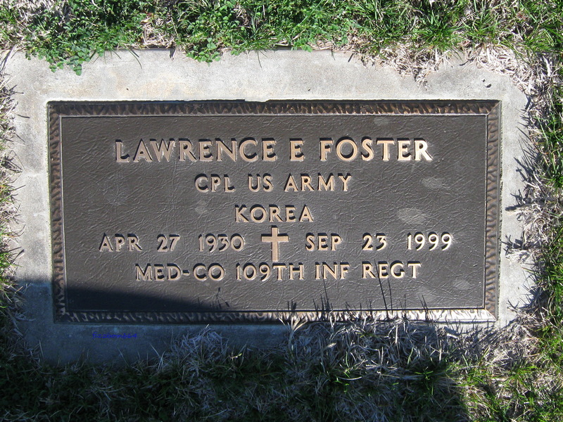 | Foster | Lawrence | 4/27/1930 | 9/23,1999 | Lawrence E. Foster; Cpl. US Army; Korea; 4/27/1930 to 9/23/1999 | Military marker. | |
