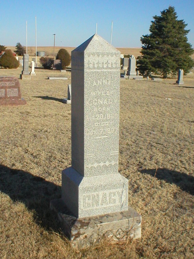 | Gnagy | Anna | 8/20/1865 | 10/7/1907 | Wife of K. Gagny | Very tall stone. Obit | |