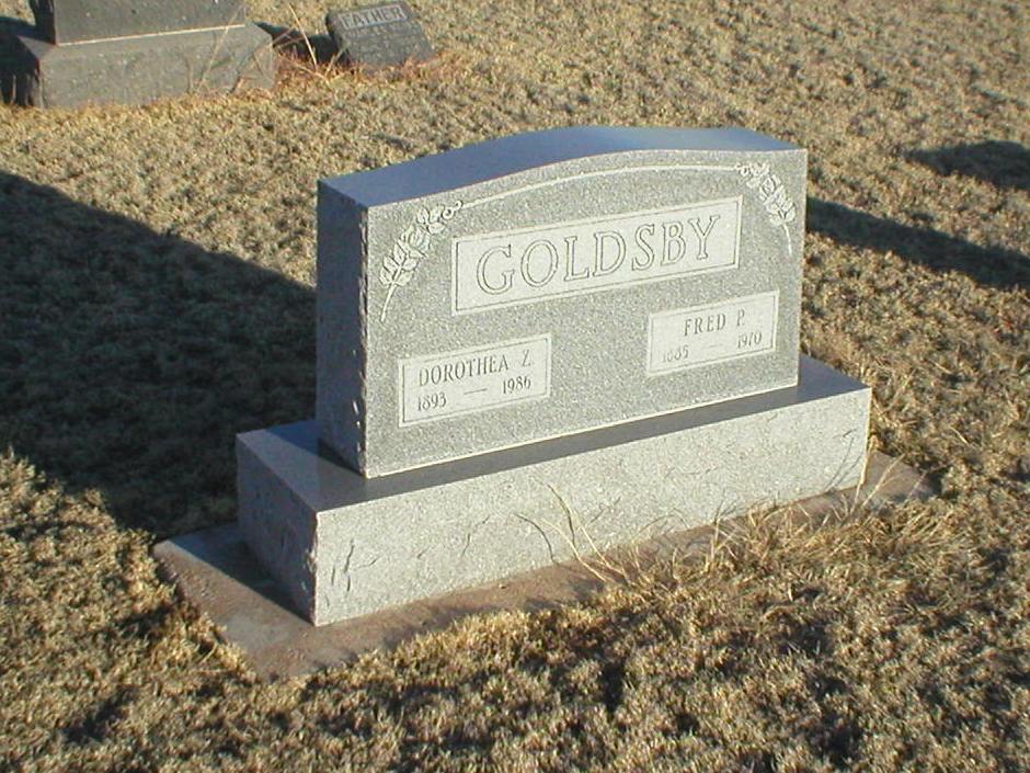| Goldsby | Fred P. | 1885 | 1970 | Same stone as Dorothea Z. Goldsby. | | |