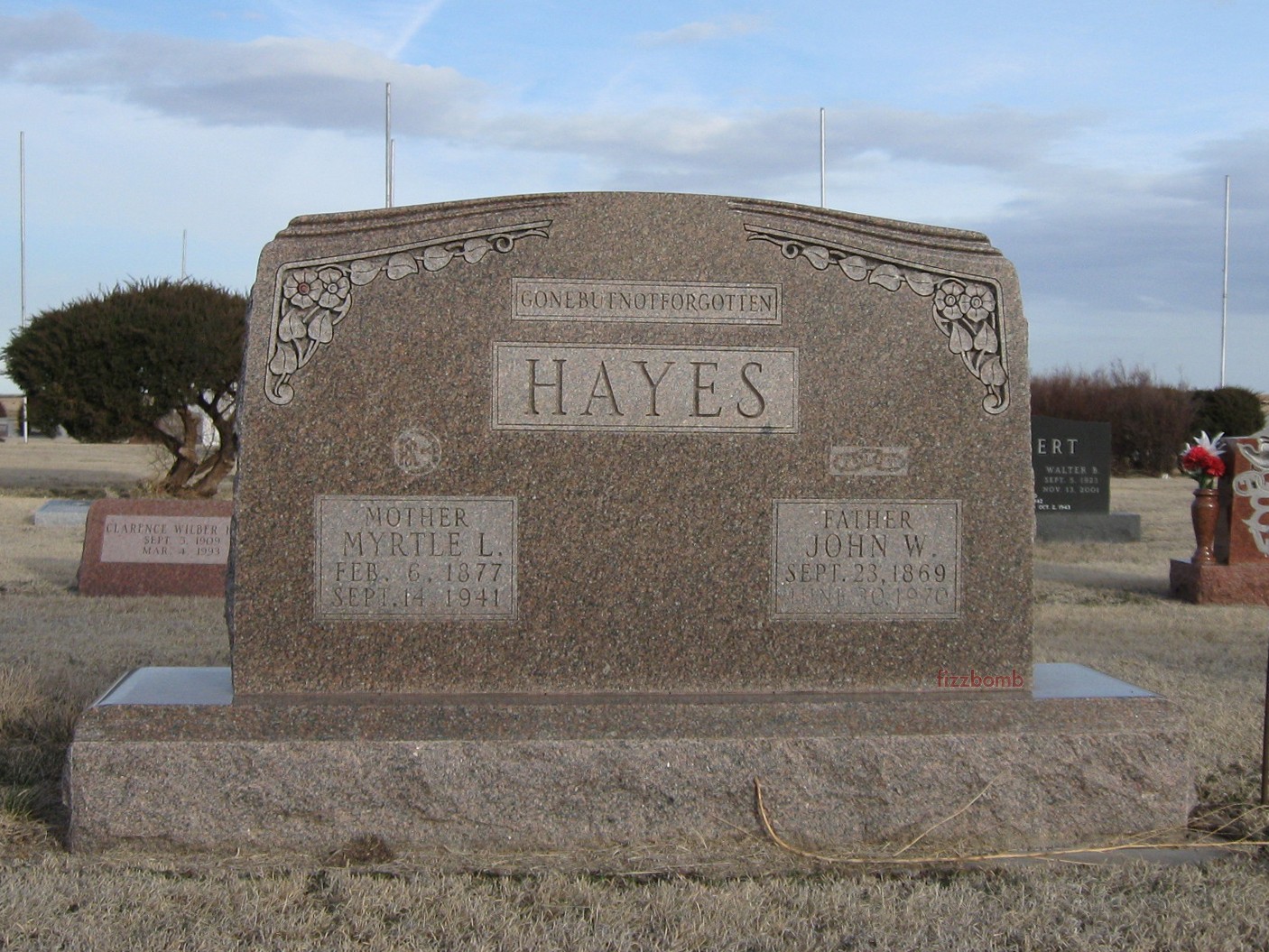 | Hayes | John W. | 9/23/1869 | 6/30/1970 | Father; Gone but not Forgotten | Same stone as Myrtle L Hayes. Oddfellow emblem. FLT emblem. Obit | |
