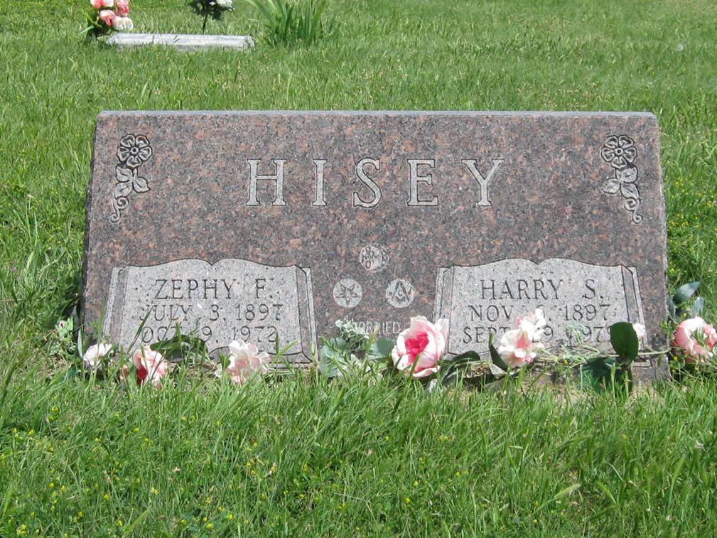 | Hisey | Harry S. | 11/6/1897 | 9/29/1979 | Married June 23, 1918 | Same stone as Zephy F. Hisey. Masonic emblem. Parents of Vernon & Pauline (Suchsland). Obit | |