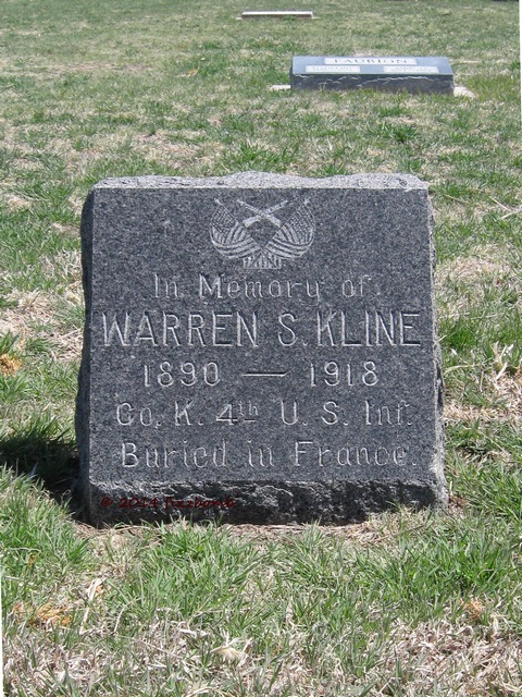 | Kline | Warren S. | 1890 | 1918 | In memory of Warren S. Kline; Co. K 4th U.S. INF; Buried in France | Son of Charles and Hanna Marie (Boyd) Kline. | |