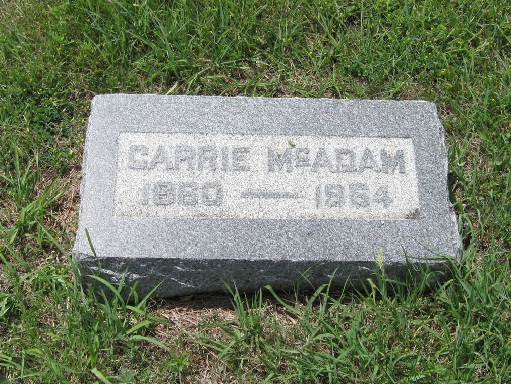 | McAdam | Carrie | 1860 | 1954 | Same stone as David McAdam; individual footstones. Rebekah emblem. | | |