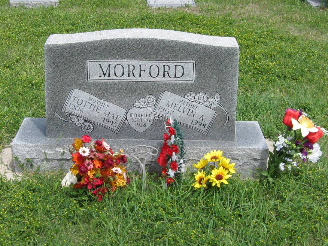 | Morford | Melvin A. | 1907 | 1998 | Father; Married September 16, 1928; Back of stone; Parents of: Francis, Melva, Lloyd, Edwin, Mae | Same stone as Tottie Mae Morford. | |