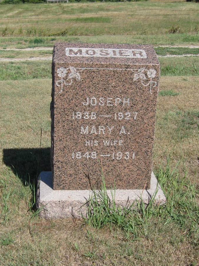 | Mosier | Joseph | 1838 | 1927 | Brother of Jeremiah Moser. Same stone as Mary A. Mosier. Obit | | |